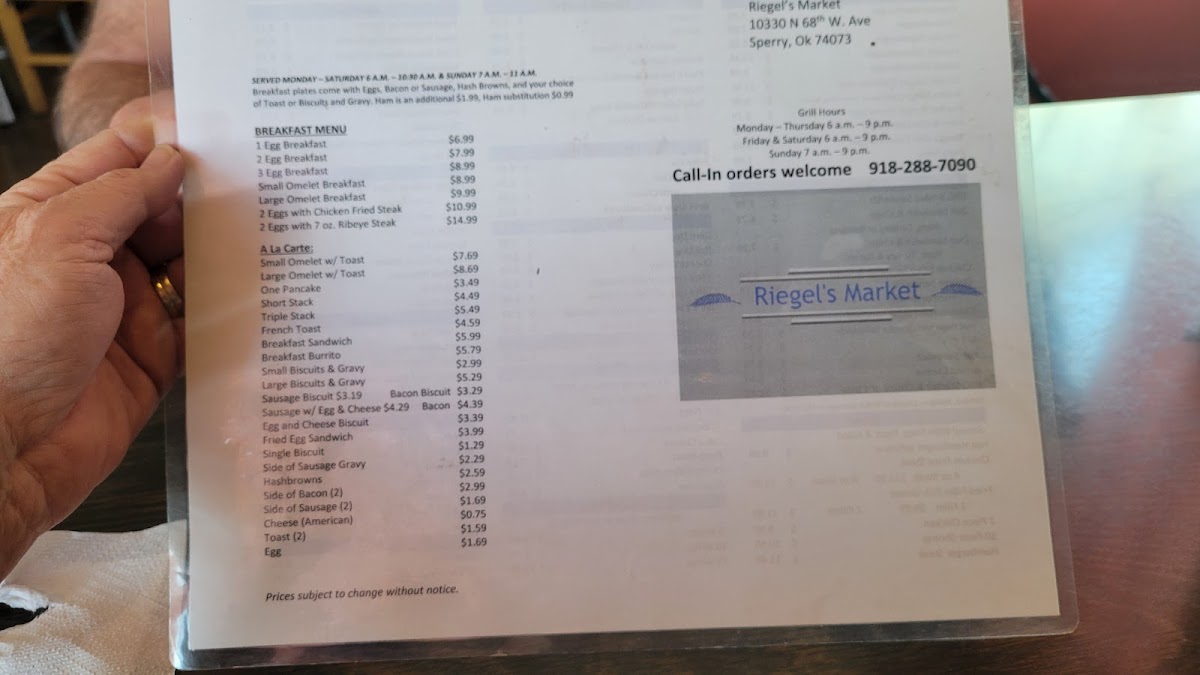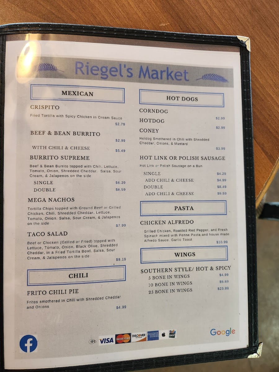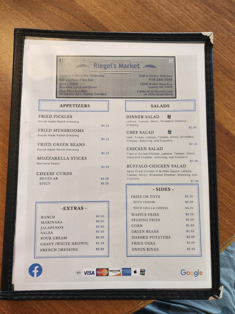 If you’re looking for a place to enjoy some hearty, home-cooked meals, Riegel’s Market Menu has exactly what you need. Nestled in Sperry, OK, this cozy spot is perfect for anyone craving delicious comfort food. From fresh-made sandwiches to mouthwatering steaks, the menu offers a great variety to suit every taste. You’ll find classic American dishes, featuring ingredients that are both local and high-quality, making each bite feel like a special treat. Whether you're stopping by for lunch or dinner, there’s always something new to try, and the friendly atmosphere makes it a great place to unwind with friends or family.